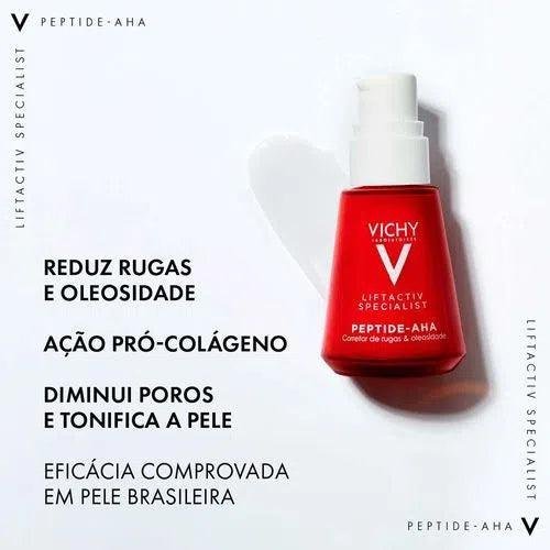 O Liftactiv Specialist Peptide-AHA, de Vichy, é um sérum corretor de rugas e oleosidade, que possui ação pró-colágeno. É nosso primeiro sérum anti-idade desenvolvido com exclusividade para a pele brasileira, que promove a redução de rugas e linhas finas, além de reduzir poros e sinais da oleosidade. Sua textura é toque seco, oil-free e proporciona efeito matte. O Liftactiv Specialist Peptide-AHA é perfeito para as peles oleosas a mistas.